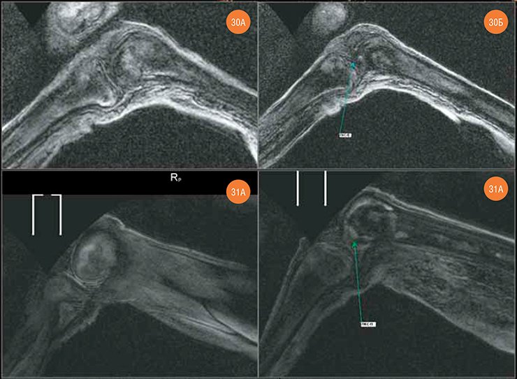 그림 1. 아크 알라하 3유적의 1호분, 얼음공주의 무릎. 윗 줄은 왼쪽무릎관절이고 아랫줄은 오른쪽 무릎관절인데 현저하게 차이가 있다. 왼쪽무릎관절30A-좌골 경골에서 연골 아래에 경화증 및 부종발견. 30B-전방십대인자가 거의 들어남(화살표) 오른쪽무릎관절31A-많이 남은 반원상의 연골, 31B-전방십대인자 변형되고 두텁지만 모습은 어느정도 유지되고 있음(레탸긴, 사벨로프, 2014).