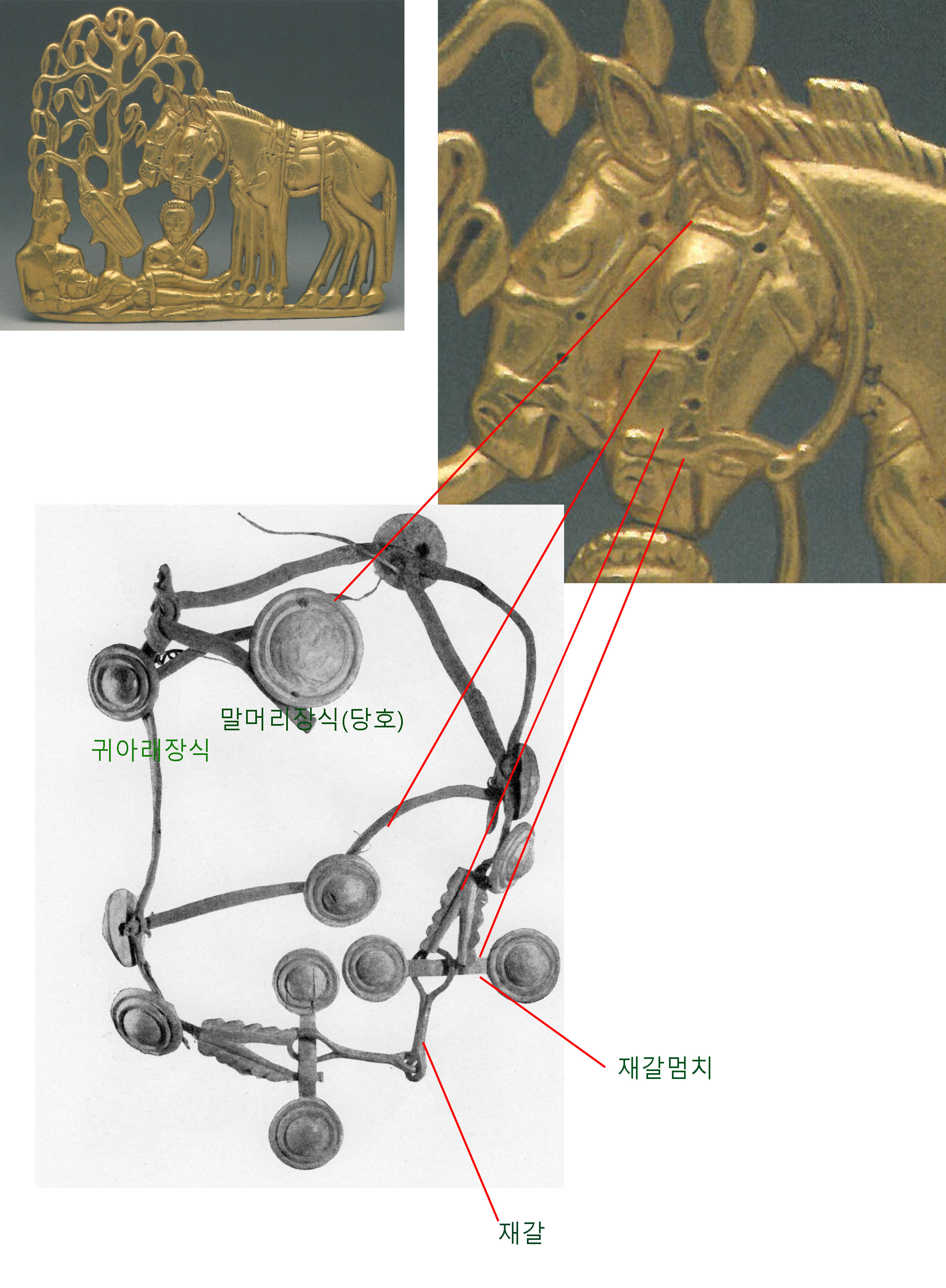 그림 1. 파지릭 5호분에서 출토된 말의 굴레와 에르미타주 소장 황금 유물에 표현된 말의 비교(김재윤편집)