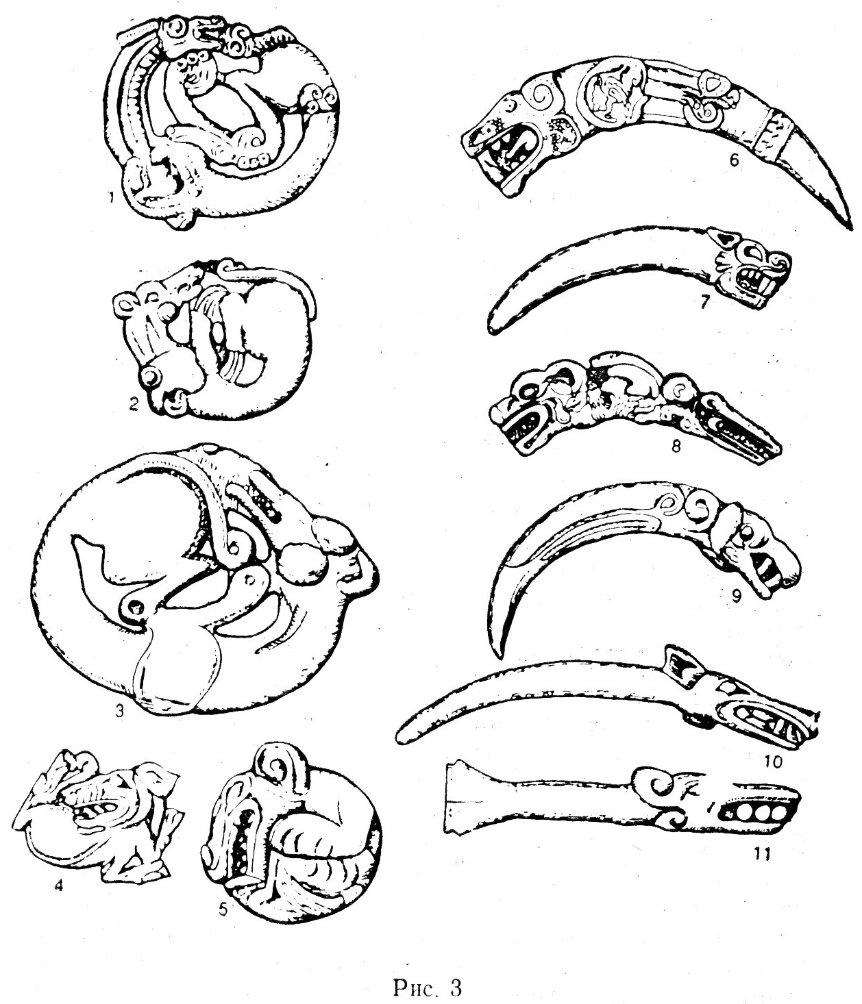 그림 2. 그림 1과 유사하게 몸을 둥글게 말고 있는 맹수류이다. 1-쿠라코프스키 유적, 2-퍄노프카 유적, 3-이르쿨, 4-파지릭 유적, 5-이식 유적, 6-브류메펠드, 7-베레지노프카,8-바르나, 9-투엑타, 10, 11, 퍄티마리 유적(페레보드치코바 그림)