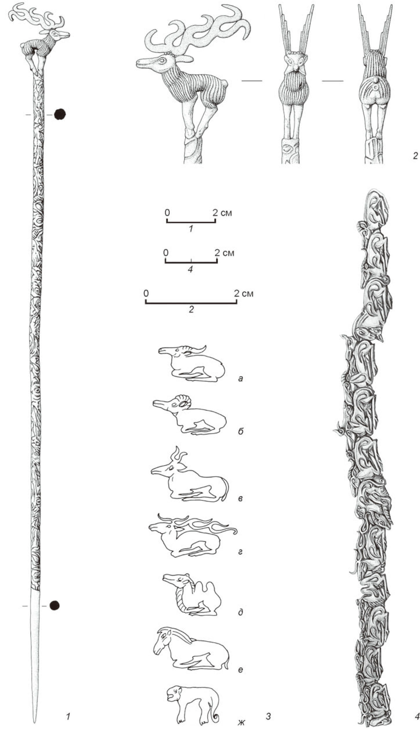또 다른 한 점은 끝에 뿔이 화려한 사슴이 장식되었다. 길이는 위에서 설명한 유물보다는 좀 작다. (길이 30.2 cm, 두께 : 막대 0.4 cm; 무게 55.52 g)이다. 가장 꼭대기의 사슴은 발끝을 세우고 있는 사슴 조각상이다. 그 아래의 동물문양장식은 오른쪽에서 왼쪽으로 양, 염소, 말, 염소, 소, 염소, 두 마리의 염소, 사슴, 낙타, 염소, 양, 사슴을 공격하는 고양이과 맹수(호랑이)가 차례로 장식되었다. 위에서부터 아래로 새겨진 동물의 발굽이 아래의 동물 머리에 붙어 있다. 동물문양장식이 붙어 있는 길이는 21cm가량이다.