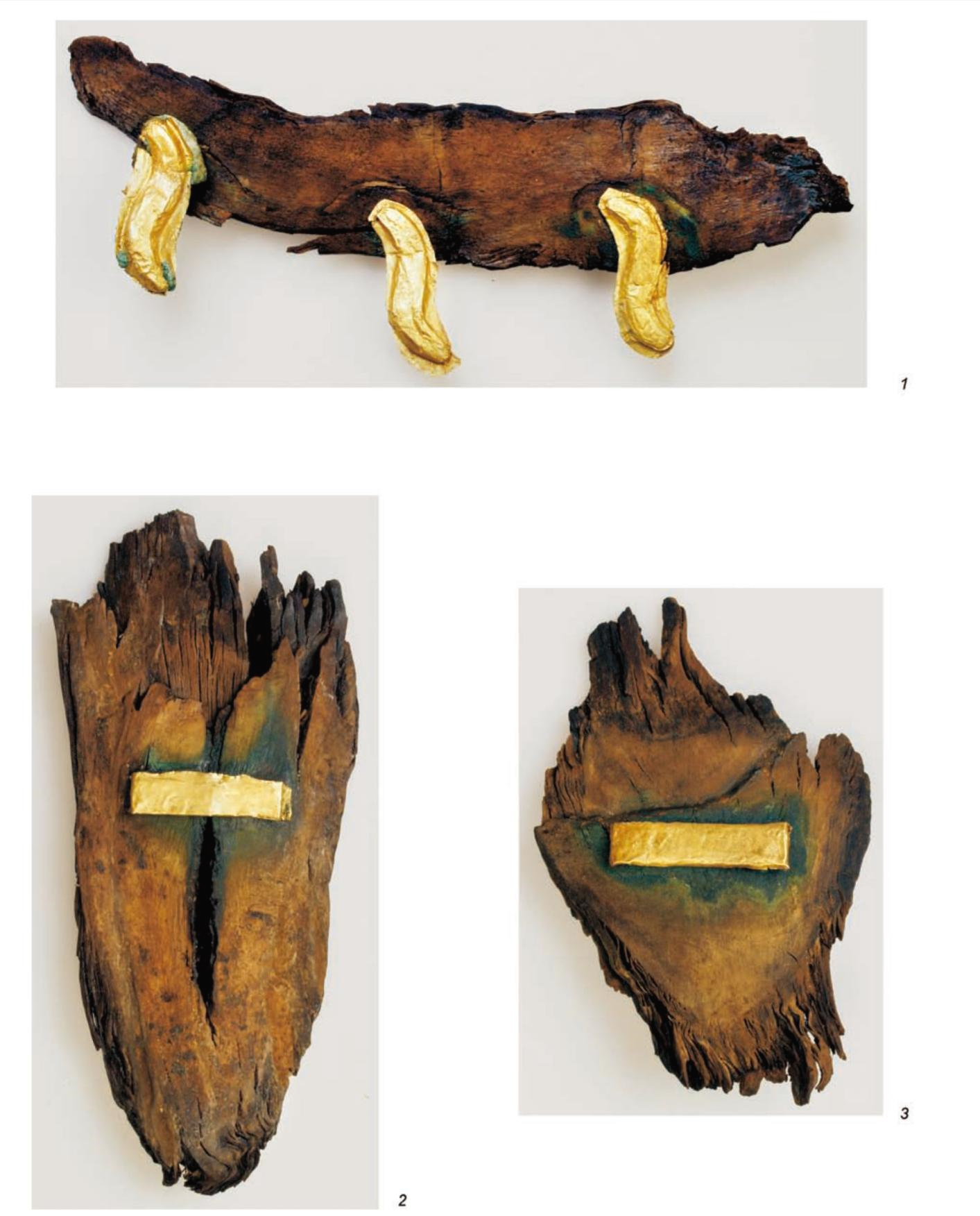 모든 유물이 상태가 매우 않 좋지만 특히 목제품(그림 3-2, 그림 4)은 상태가 좋지 않다. 그런데 이 유물은 무엇이었을까? 나무로 된 유물은 목제 안장의 일부로 생각한다. 목제품 가운데서 금판이 남아 있는 유물(그림4-1)은 아크 알라하 3유적, 아크 알라하 1유적에서 출토된 안장덮개에 부착되었던 물고기의 장식에서 비늘과 유사하기 때문이다. 실제로 물고기모양 장식은 파지릭 유적 뿐 만 아니라 아크 알라하 1 유적에서 모두 안장덮개의 장식이었다. 또 다른 예는 파지릭 유적 2호분의 남성미라 우측 다리에 문신이 물고기 문양이었다.