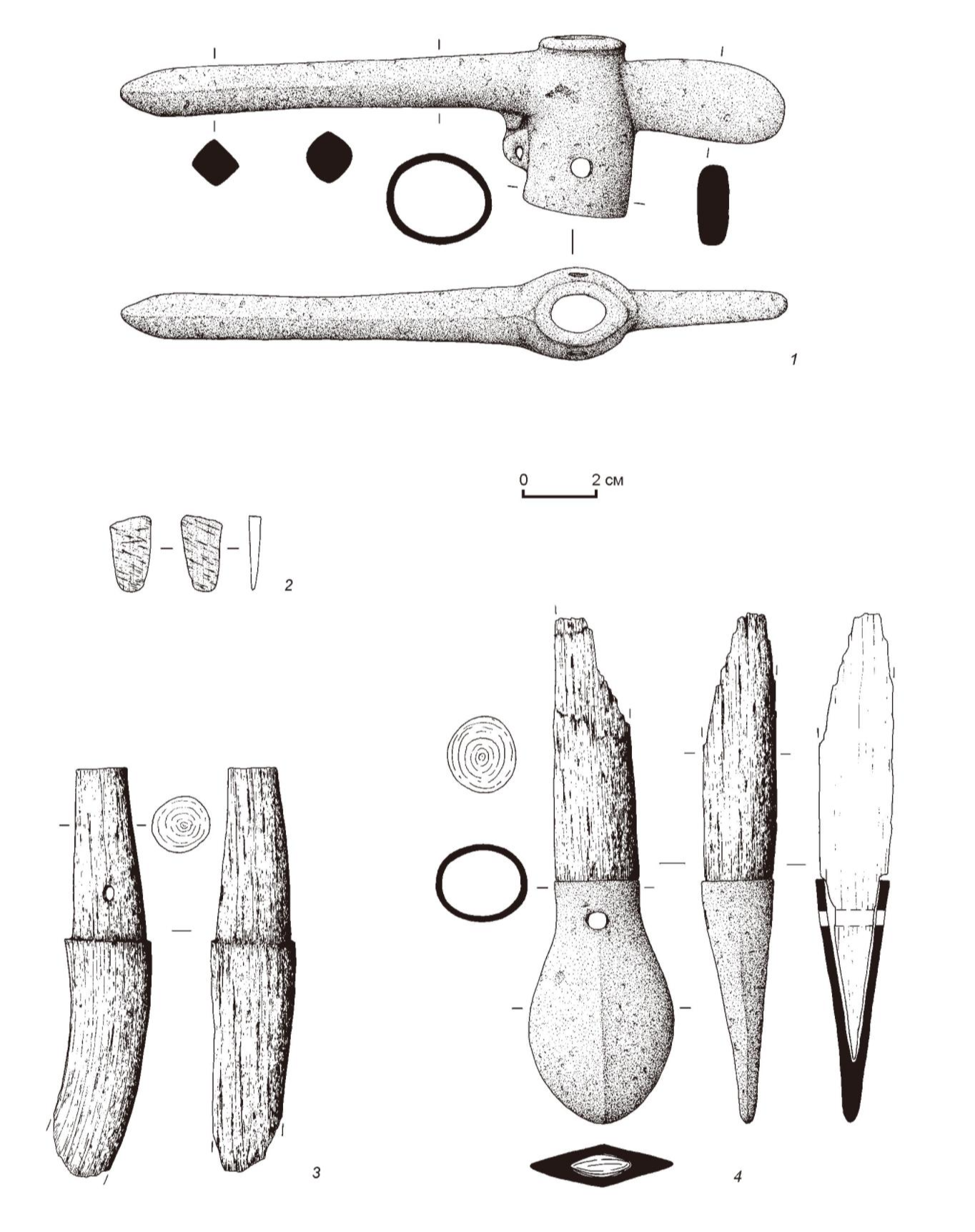 그림 7. 아르잔-2호 무덤방 20호 1호(1,2)와 2호인골(3); 1-뿔, 2,3-청동