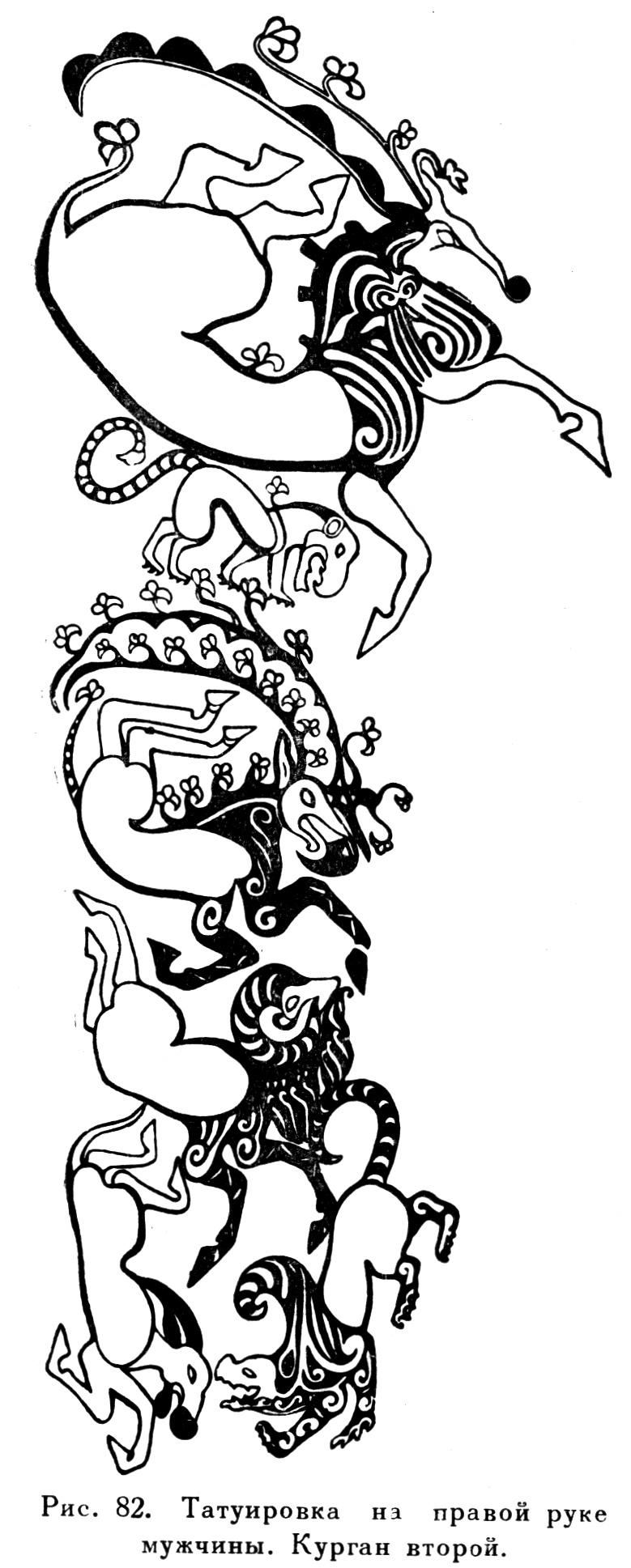문신은 파지릭 2호분의 남성미라, 아크 알라하 3유적의 여성미라에서도 확인되었다. 이 남서의 문신이 가장 간단한 편이다. 러시아학계에서는 이 세 명을 문신한 타투이스트가 같은 사람일 가능성이 있다고 생각한다. 실제로 나이테 연대측정법의 결과 이 세 유적을 매장한 시기는 거의 비슷하다. 특히 파지릭 2호분의 남성미라 오른쪽 어깨(그림 2-1)에 새겨진 문신 가운데 첫 번째 문신인 우제류(머리없는)와 그리핀이 결합된 그림은 동물의 자세와 구도가 거의 비슷하다.