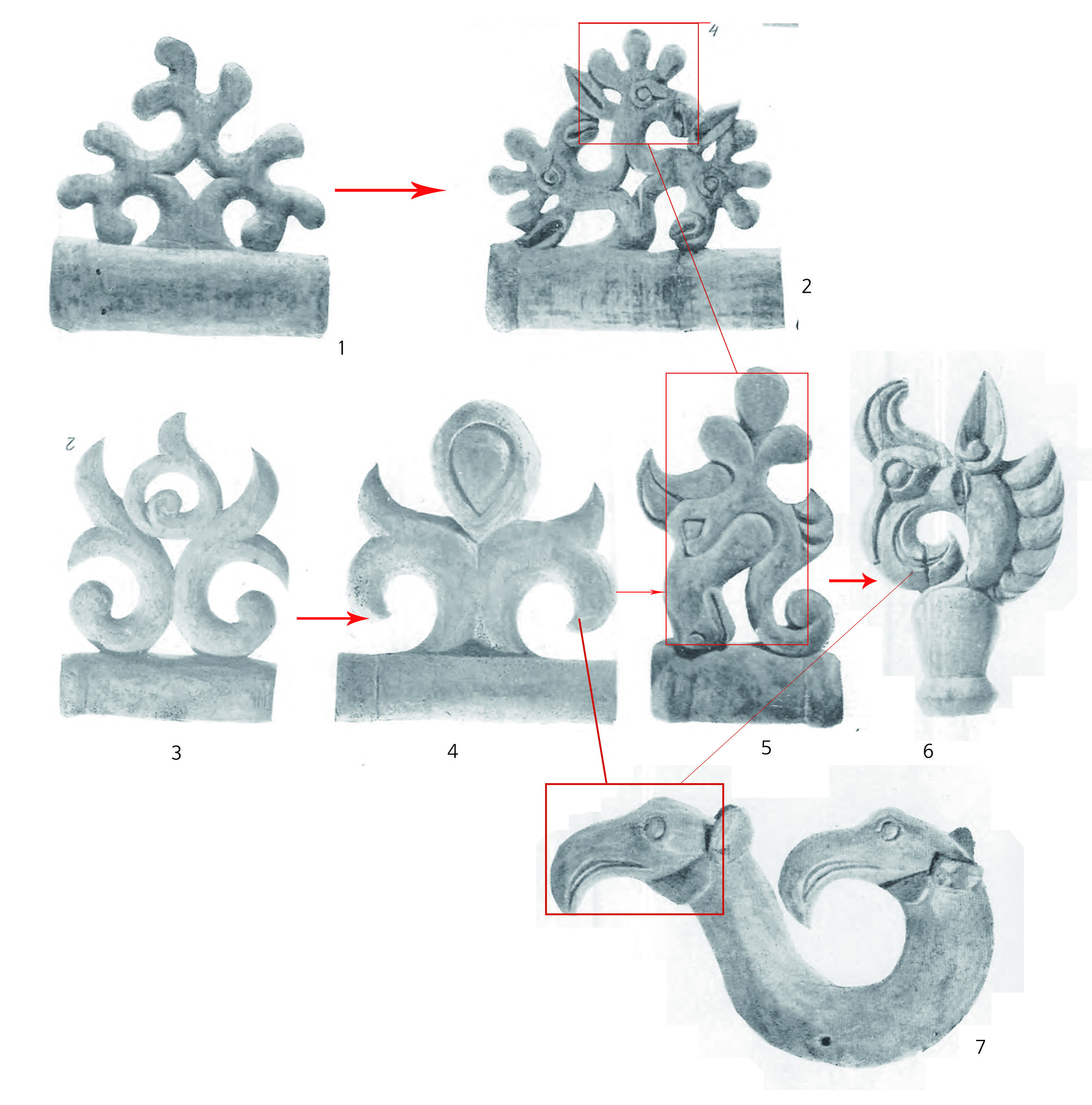 사슴머리가 3개 붙은 장식판(그림 1-2)은 어떤 식물 세 장을 붙여서 표현한 것(그림 1-1)을 식물을 대신해서 사슴얼굴을 표현한 것으로 볼 수 있다. 사실 사슴머리 3개 붙인 장식판도 사실적이지만 추상적인 표현이라는 점에서 풀장식에 사슴(그림 1-2)을 새겨 넣은 것이라고 보는 것이 더 자연스럽다. 물론 사슴을 단독으로 표현한 유물도 있다. 그림 1-2도 사슴과 풀의 결합물이다.