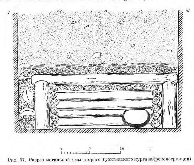 무덤구조는 앞서 설명한 파지릭 유적과 흡사하지만 차이점도 있다. 무덤구덩이를 파고 나무로 된 무덤방을 설치한다는 점은 같은 구조이다.
