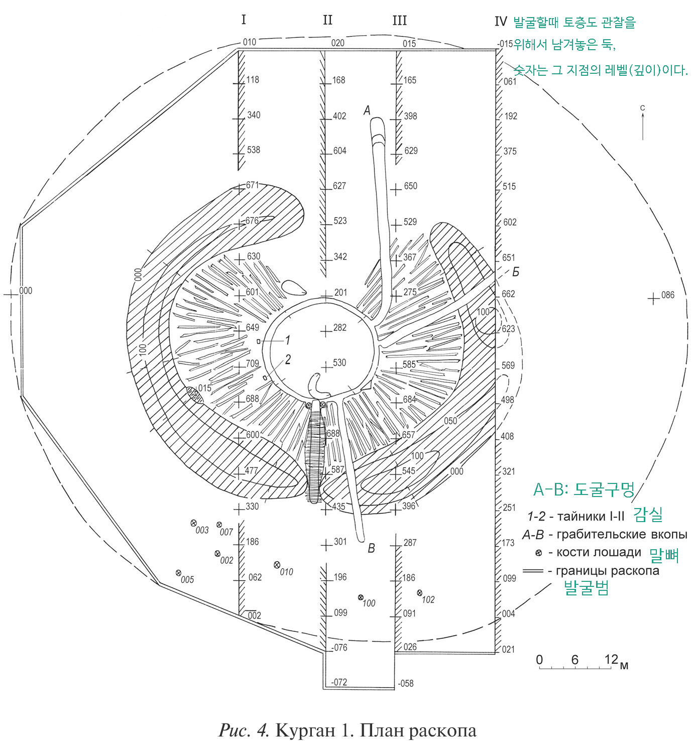 바닥의 유물: 1-철제품, 2-인골의 흔적, 3-철제품의 흔적, 4-청동솥, 5-마구와 안장부속품, 6-청동재갈, 7-금제장식판, 8-목제잔의 흔적, 9-황금 장식, 10-철제 검, 11-금제 장식판, 12-황금 사슴의 귀, 13-석고? 판, 14-황금구슬, 15-황금 비드, 16-황금 사슴, 17-청동판, 18-철제 검, 19-청동검, 20-황금 나사, 21- 황금 귀걸이, 22-석제품, 23-황금 구슬, 24-황금 장식판, 25-깨진 토기, 26-황금 펜던트, 27-청동 솥, 28-청동 화살촉