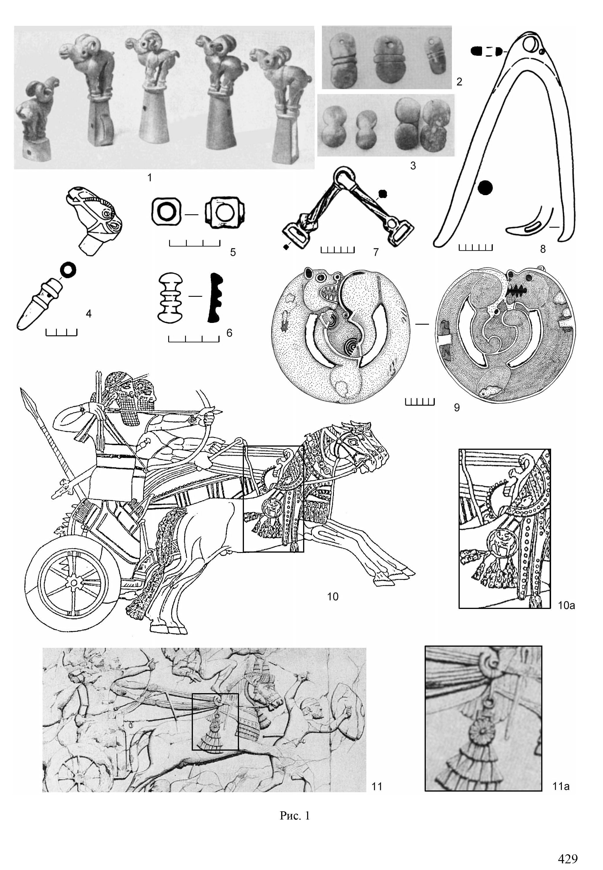그림 2. 아르잔-1호의 전차 관련 유물(1~9)과 아시리아의 왕 아슈르나시르팔 II세(10, 10a)의 궁전벽 및 사르곤 II세의 궁전벽(11, 11a) (스미르노프 2012)