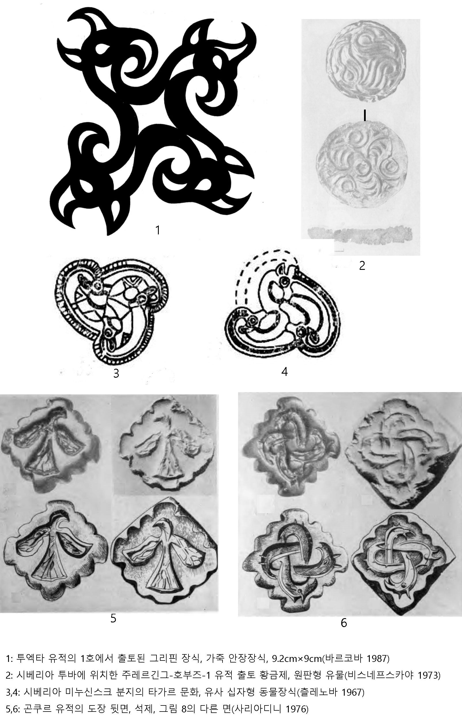 기원전 6세기 투엑타 유적 1호에서는 가죽으로 된 안장장식(그림 2-1)에 십자형 구도의 그리핀이 발견된 바 있다(바르코바 1987). 비슷한 유물이 타가르 문화(그림 2-3,4)에서도 확인되었는데, 구도만 비슷하지 묘사된 동물은 다르다고 필자는 생각한다.