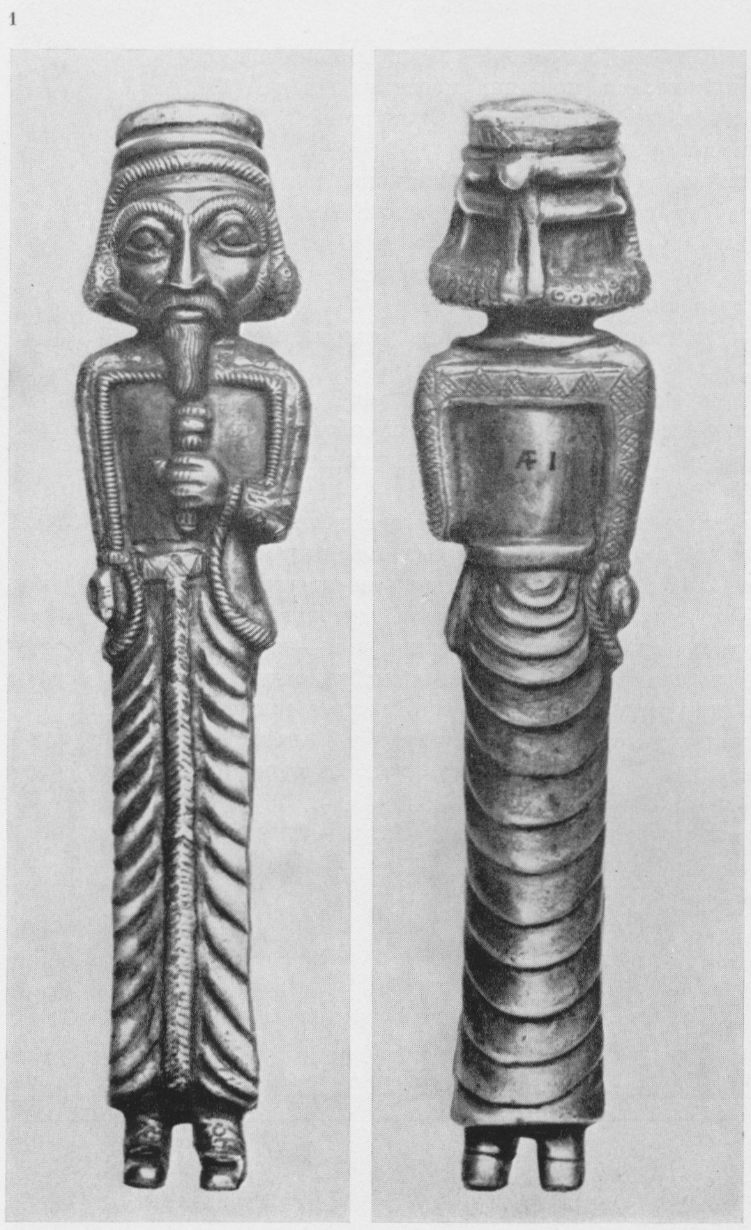 원통형 모자를 쓴 은제 입상은 얼굴생김새도 평면판에 등장하는 스키타이 인과 다르다. 큰 눈과 코 끝이 화살표처럼 생긴 모습도 그러하고, 수염 스타일도 스키타이 인이 턱 전체를 덮는 것과는 달리 턱 아래만 길게 길렀다.