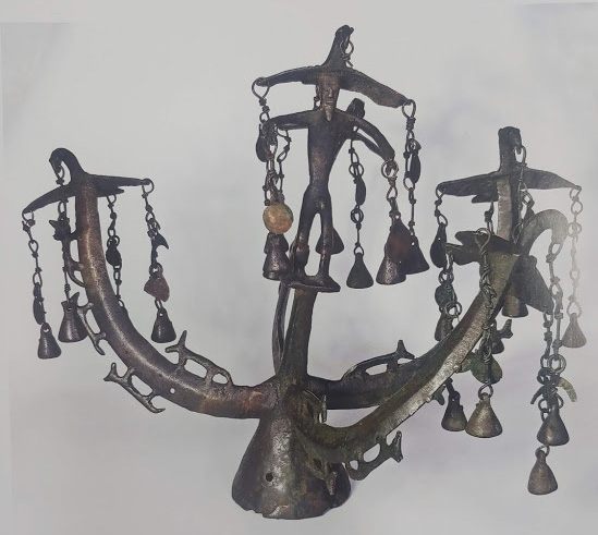 그런데 유적에서 출토되지 못하고 지표에서 우연히 발견된 유물 가운데 흥미로운 간두령이 있다. 사방으로 가지가 네 내 퍼져 있고 중앙에 팔을 벌인 남성이 묘사된 것이다. 그의 머리에는 팔을 벌인 새가 그의 머리를 덮고 있다. 두 남성의 양손 끝에는 방울이 달려 있고, 그의 머리 위에 새의 날개 끝에도 방울이 달려 있다. 청동 방울가지의 하단에는 정확하게 어떤 동물인지는 알 수 없지만 꼬리와 귀의 표현이 뚜렷한 육상동물이 가지 끝을 향해 달려 있다.