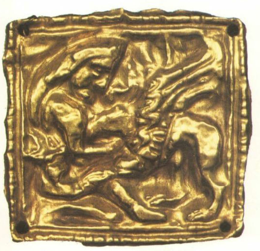 그런데 기원전 4세기 체르토믈리크 유적에서는 둥근 원판에 남성이 동물과 싸우는 장면이 묘사된 것이 발견되었다. 이 남성은 벌거벗은 채 사자의 목을 조르고 있었다(그림 1). 거의 같은 구도로 스키타이 남성이 그리핀과 싸우는 장면이 네모장식판으로 만들어져 유적에서 출토되었다(그림 1). 이 남성은 턱수염과 복장으로 보아서 스키타이 남성이다. 둥근원판을 헤라클레스라고 한다면 이 남성은 헤라클레스의 역할을 하는 스키타이 신이었을 것이다(그림 2).