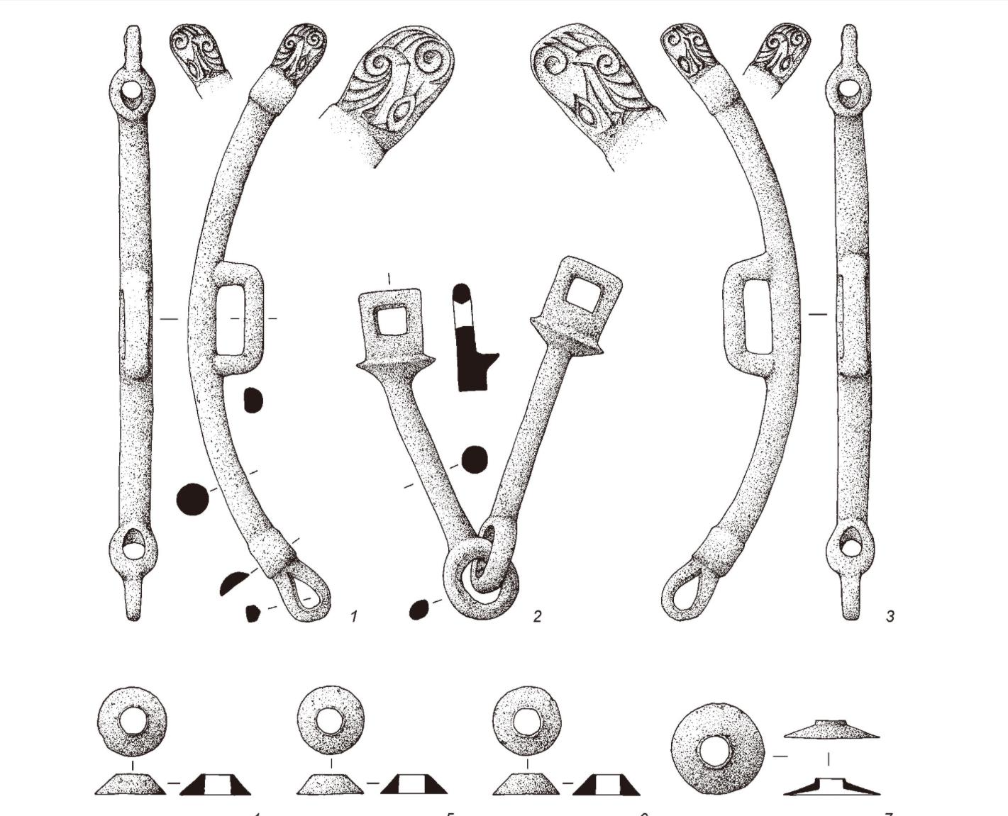 멜구노프 새 장식은 머리는 측면, 몸통은 정면을 향하고 있다. 간두식에 표현된 유물도 새 머리의 측면이다. 하단에 자루가 착장되었다면 전체적인 구도는 멜구노프와 통하는 면이 있다. 흑해지역에서 새 장식은 날개를 펴고 머리를 돌리고 있는 새 장식과 새의 머리만 표현된 간두령 장식이 먼저 등장하며, 기원전 5세기 가량이 되면 점차 새의 표현은 자연스럽지 않고 부리만 강조되어 나타난다.