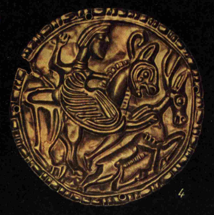 기원전 5세기 유적 중에 한 곳인 두로프 쿠르간(그림 1)에서는 둥근 메달 모양장식판에 사슴이 표현되어 있다(푸지코바 1966). 앞다리의 무릎은 굽어있고 접은 앞다리와 서 있는 뒷다리의 굽은 서로 겹쳐져 있다. 사슴의 자세는 다리를 배쪽으로 접은 자세와는 차별이 있는 것으로 동물투쟁문양에서 확인되는 것이다.