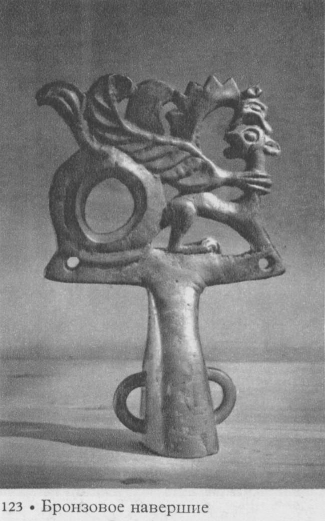 주로 그리핀이나 다른 동물들이 부착되지만 크라스노쿠트 쿠르간에서 발견된 유물은 그리핀이 다른 동물을 잡아 넣는 형상이다. 이 맹수는 그리핀처럼 보이지만 꼬리가 뱀처럼 말려 있어서 해마라고 여겨지며, 그리스적인 스타일이라라고 보고 있다(페레보드치코바 1994). 하지만 그리핀+해마의 과장된 눈과 표면을 처리하는 제작방법은 스키타이 스타일이다.