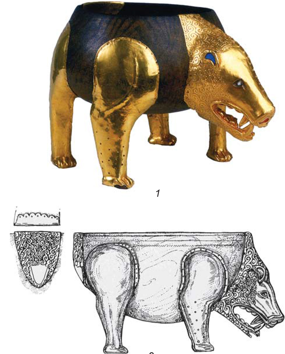 그 중에서 알렉산드로프스키폴 유적과 챠스티에 유적에서 호랑이과는 아니면서 맹수로 보이는 유물을 곰(그림 1)으로 보았다. 뿐만 아니라 볼가강 유역의 필리포프카-1 유적 1호에도 목제 잔의 장식으로 곰 장식이 발견되었다. 곰의 머리, 꼬리와 다리가 금으로 제작된 것이다(그림 3).