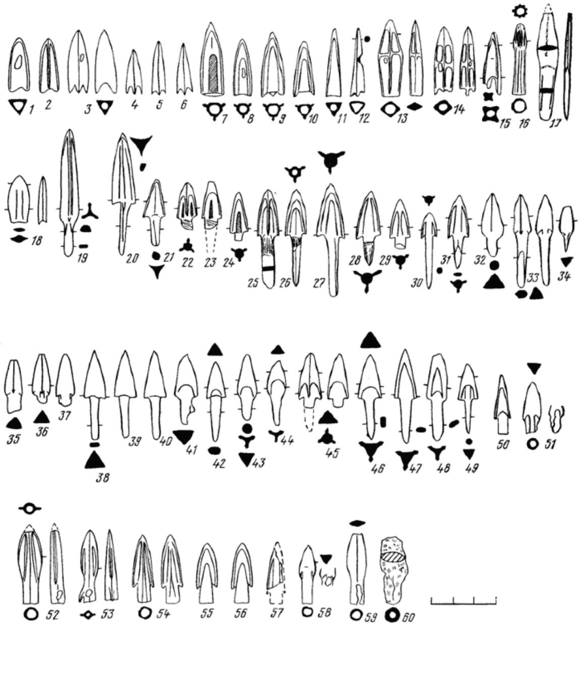 흑해의 우안, 코카서스 산맥 북쪽에 위치한 켈레르메스 유적(기원전 7세기)에서 출토된 화살촉과 기원전 6세기 아밀호보 유물(그림 1-52,53)은 매우 유사하다. 흥미로운 점은 이 지역에서 시간이 흐를수록 켈레르메스 화살촉처럼 생긴 유물이 많아진다.