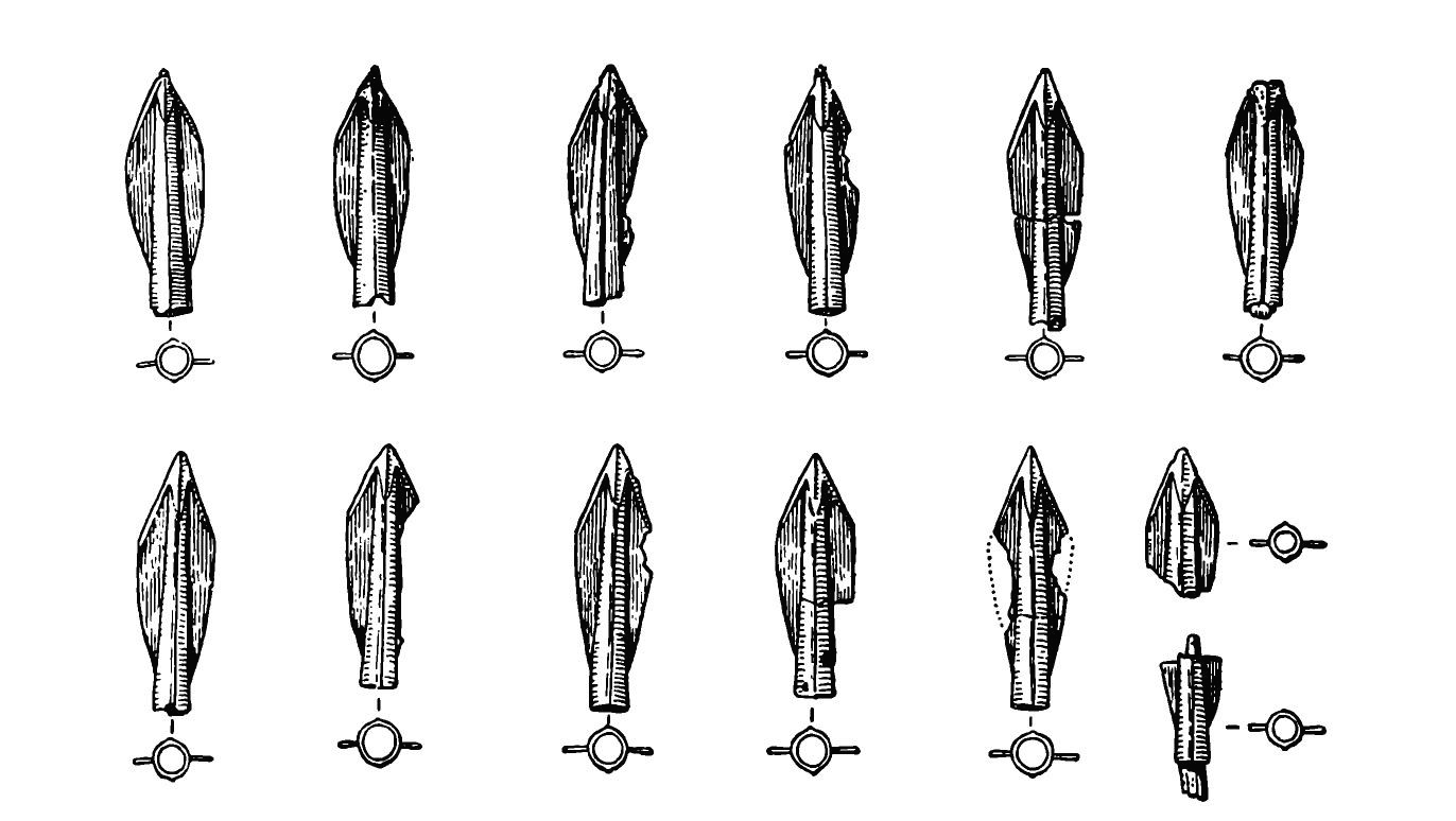 카자흐스탄의 동부지역 실릭티 유적에서 출토된 청동화살은 단면(자른면)이 원형이고 양쪽으로 능이 붙은 형태이고, 평면은 자루를 끼울 수 있는 슴베가 있는 모습이다. 알타이의 기원전 7세기경에 발견되는 화살촉과 비슷해 보이지만 약간 다르다. 능이 같은 간격으로 3개 달린 것이 알타이의 기원전 7세기 유물이다.