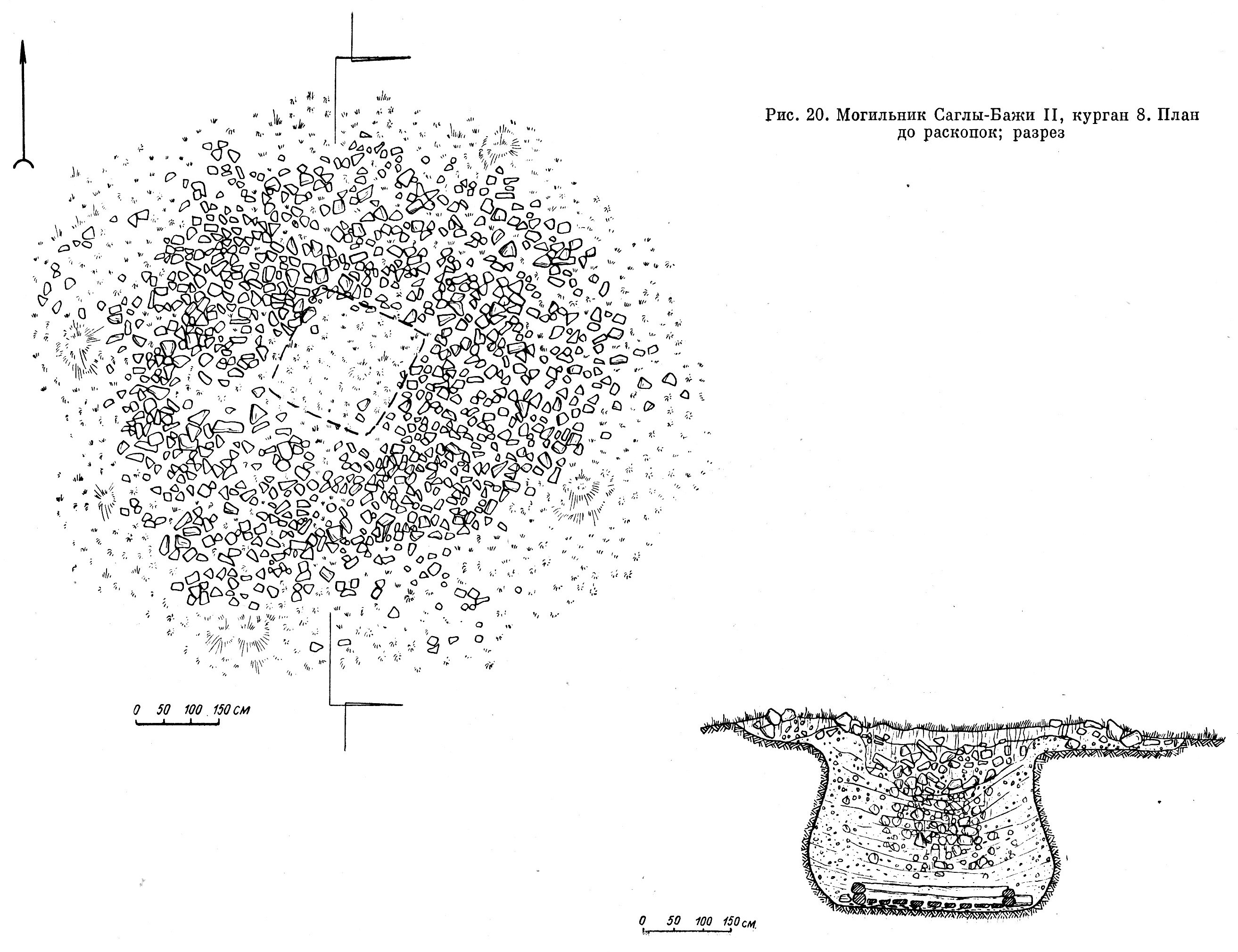 그림 3. 사글리 바쥐 II유적 8호의 무덤 가장 위 평면도(위)와 단면도