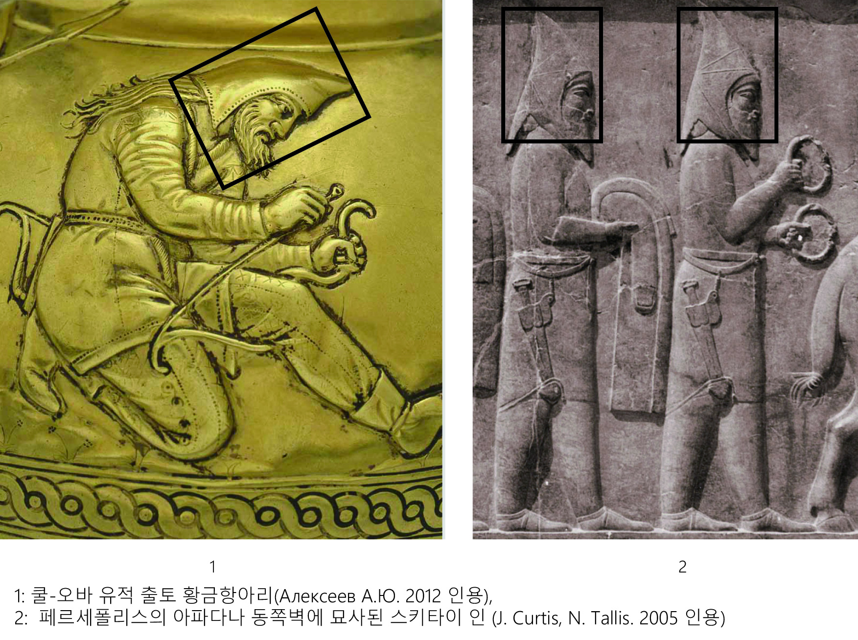 간접적으로 스키타이 사람들이 고깔모자를 썼다는 것을 알 수 있는 것은 기록과 페르시아의 궁전(그림 3-2)에 남아 있다. 헤로도투스가 쓴 역사에서 다른 민족과 구분하는 스키타이 사람들의 특징 중에 하나로 고깔모자를 언급한 바 있다. 페르시아의 아케메네스 궁전에도 스키타이 사람들을 표현할 때 귀를 덮는 고깔모자가 표현되었다.