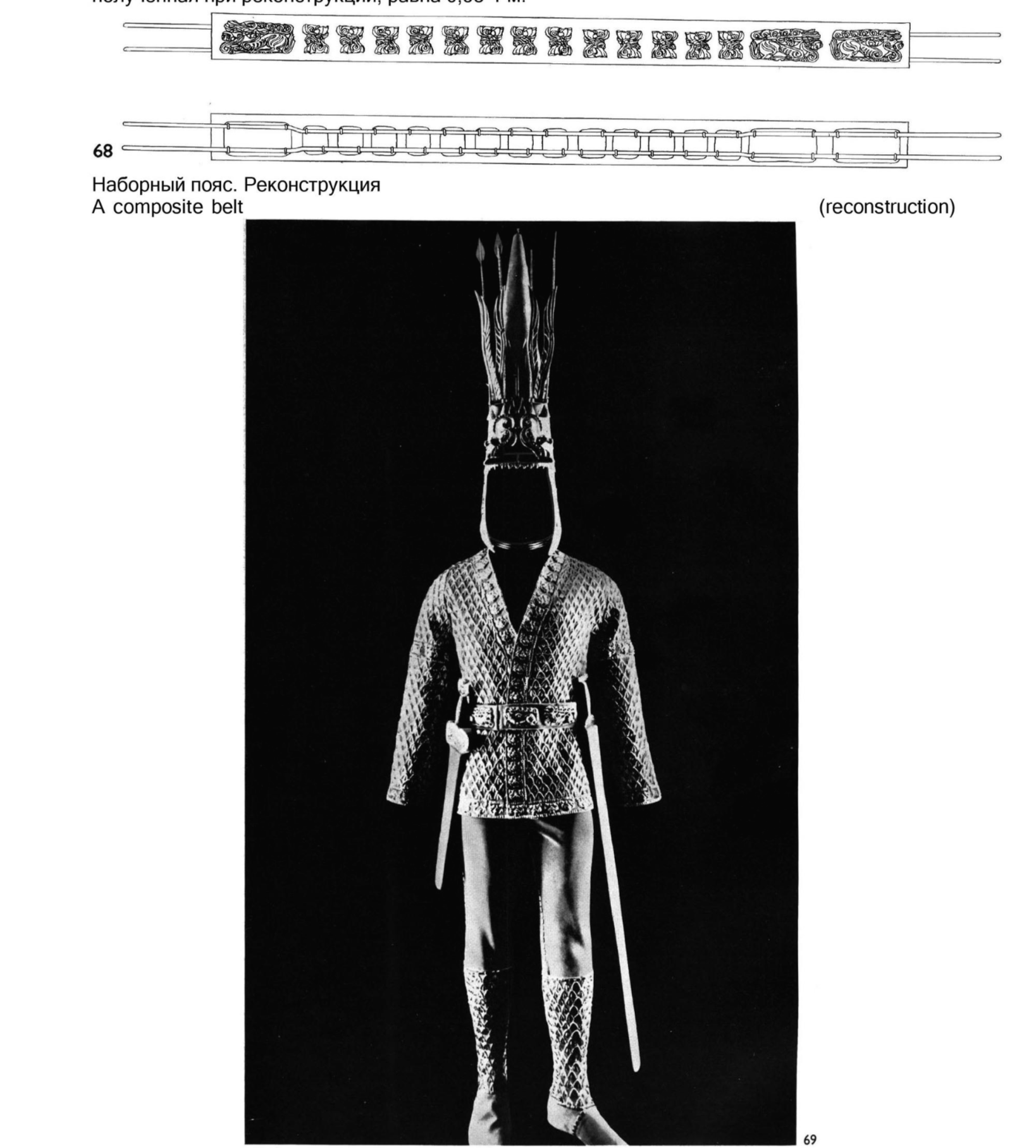 알타이의 남성이나 여성은 남녀 구분이 없이 비슷한 상의를 착용했고, 여밈이 없는 것(그림 6)이 특징이다. 경우에 따라서는 모피코트가 유적에서 그대로 출토되기도 했다. 특히 남성의 경우는 허리띠를 착용하고 무기를 착장하는데, 한 쪽에는 고리트, 한쪽에는 검과 칼 및 투부를 착장했다. 아크 알라하-1호의 1호분과 베르흐 칼쥔 II유적의 3호 남성을 예로 들 수 있다.