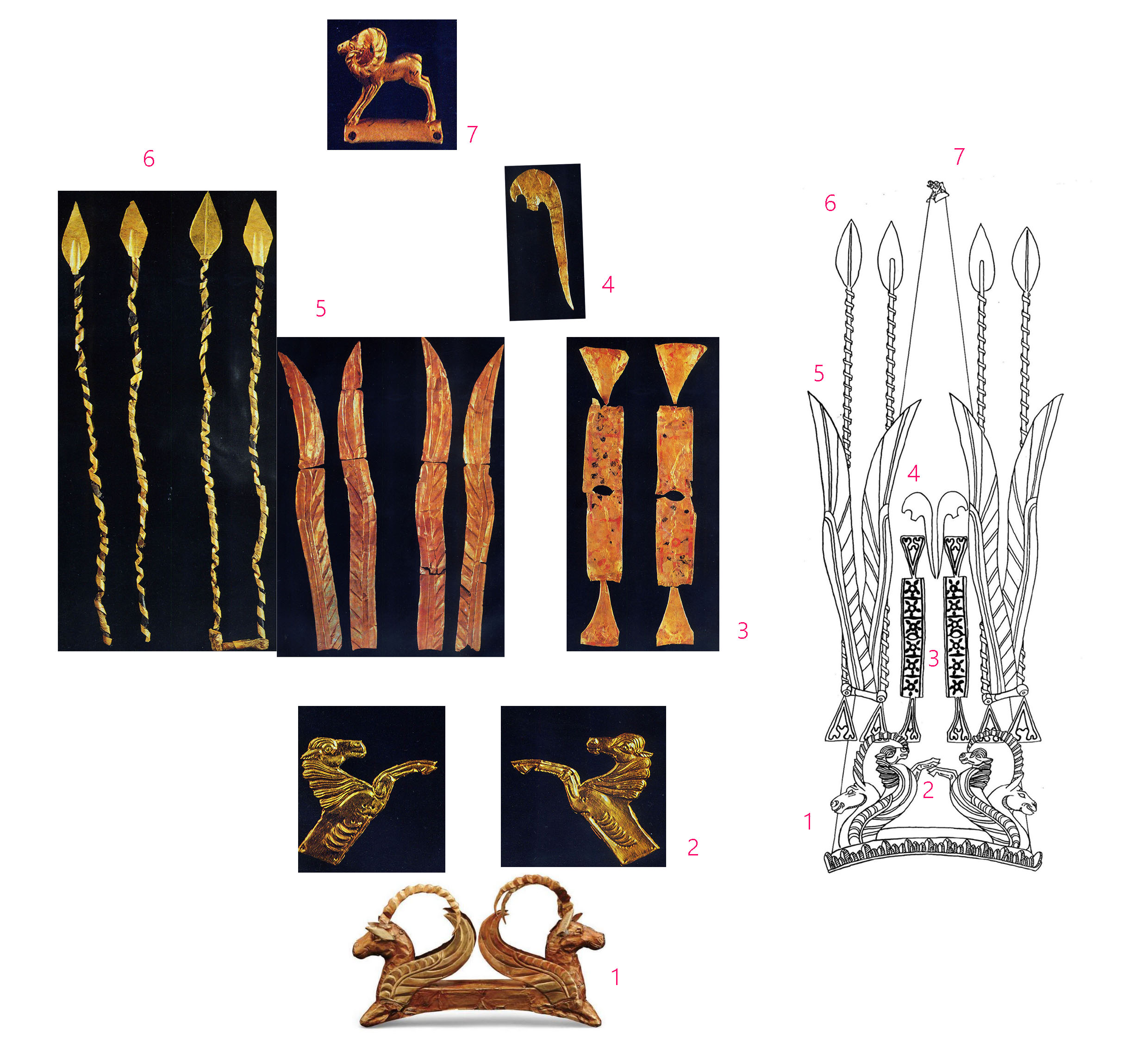 고깔모자는 높이가 60cm가 넘는데, 황금재질로 된 각종 형상물(동물과 식물)이 부착되어서 카자흐스탄 연구자들은 큰 의미가 있는 것으로 생각한다. 주로 호랑이(그림 2-4~6)와 새(그림 2-1), 사자(그림 2-2), 말(그림 1-2)은 납작한 금판에 선각 기법을 넣어서 표현한 것이고, 산양(그림 1-1)과 염소(그림 1-7)만 입체적으로 만들어진 것이다.