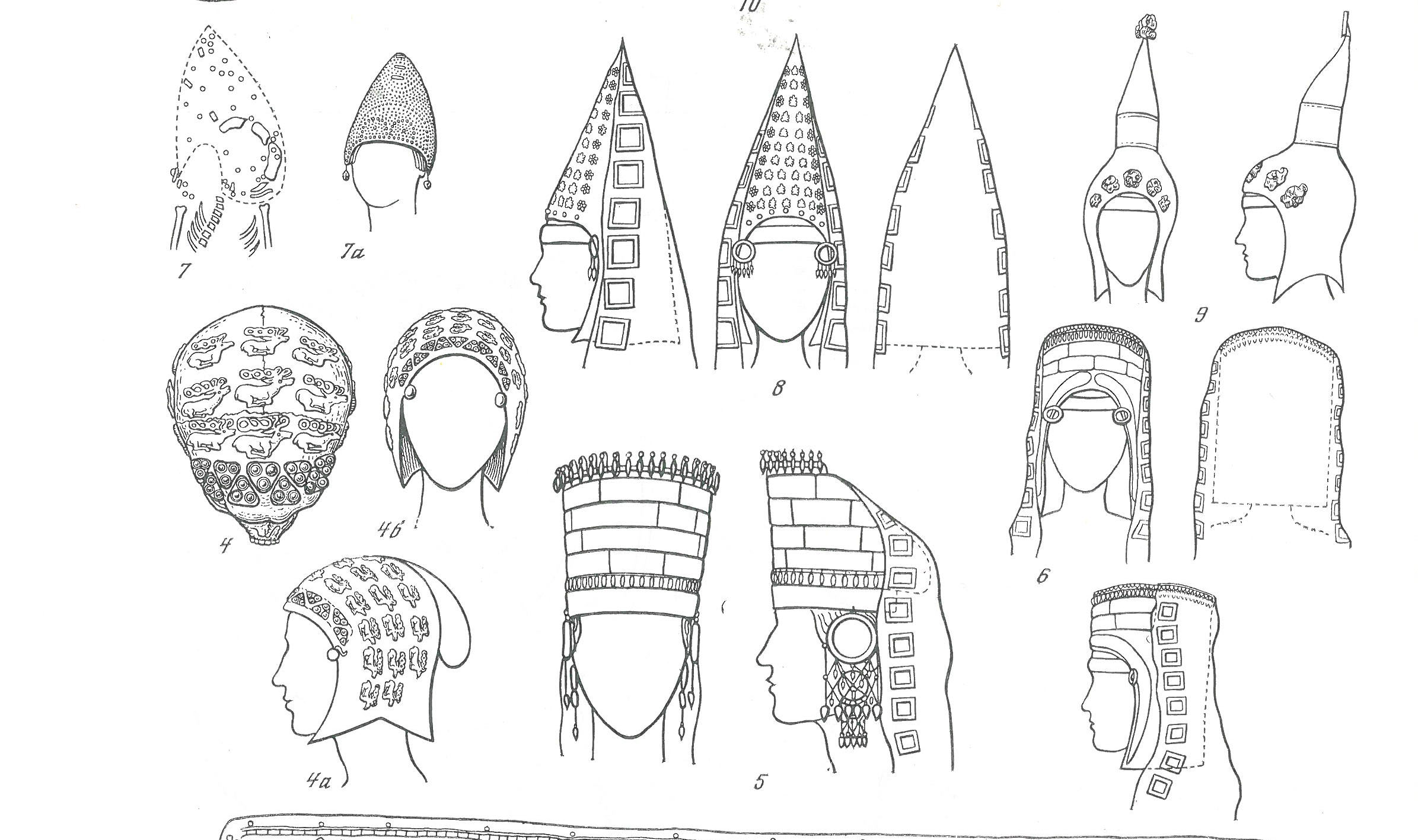 흑해지역에서는 남성은 고깔모자를 쓴 모습이 종종 발견되지만, 여성의 머리장식은 좀 더 다양하다. 유사고깔모자 스타일도 있지만 끝이 편평한 스타일도 발견되는데, 그 아래에 드리개를 달았는데, 관자놀이부분이 장식되도록 한 것이다(그림 7).