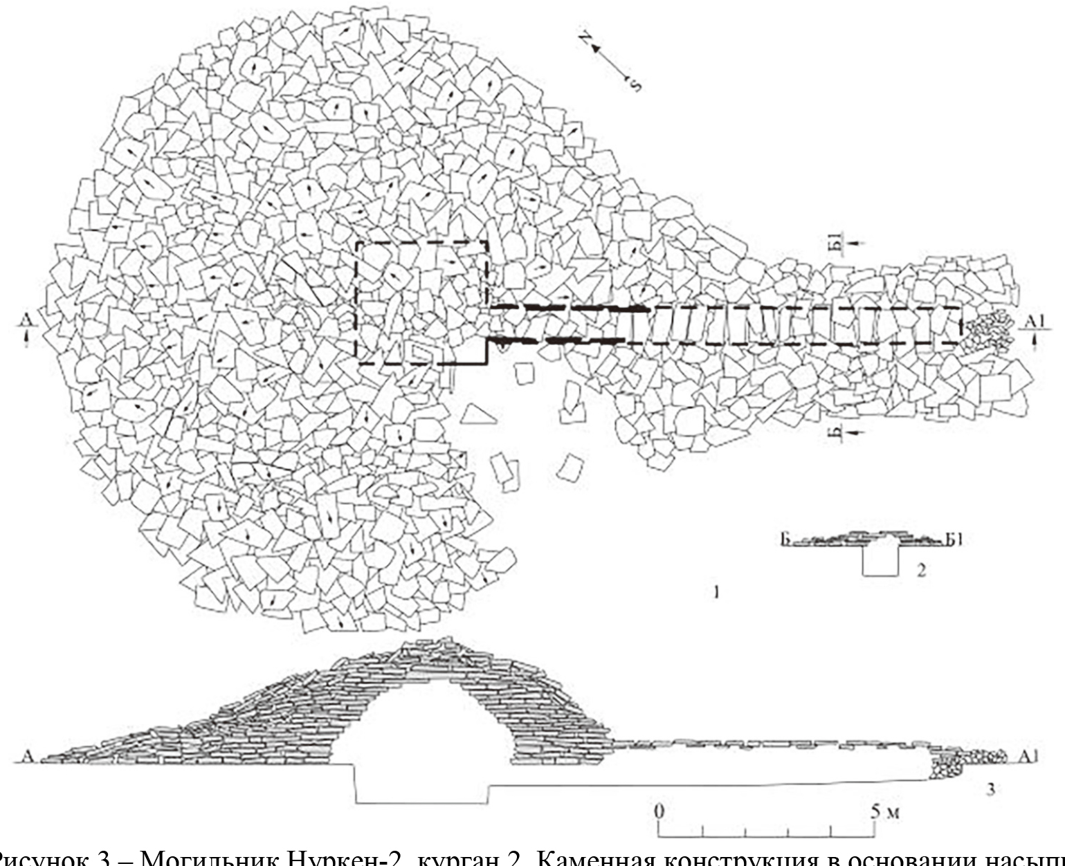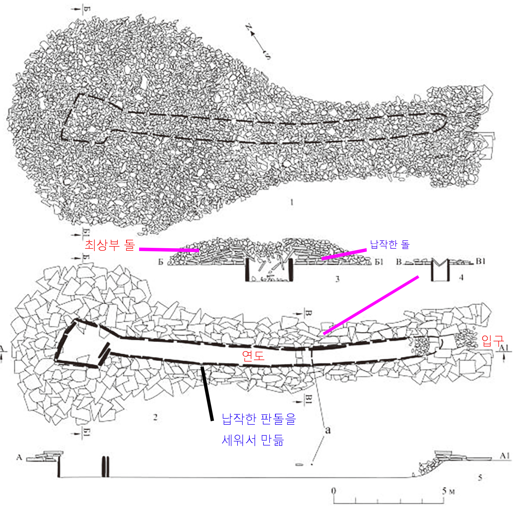 대표적인 무덤이 누르켄-2 유적이다. 이제까지 살펴본 무덤구조와는 전혀 다른데, 입구부터 지하로 들어간 연도와 무덤방의 바닥 높이가 같다. 지하라고 표현했지만 깊이 1m(2호기준)정도이고, 연도와 매장주체부까지 납작한 돌을 세워서 축조했다(그림 1-2). 매장주체부는 납작한 돌을 눕혀서 무덤 벽을 쌓아 올린 것이다(그림 1-3).