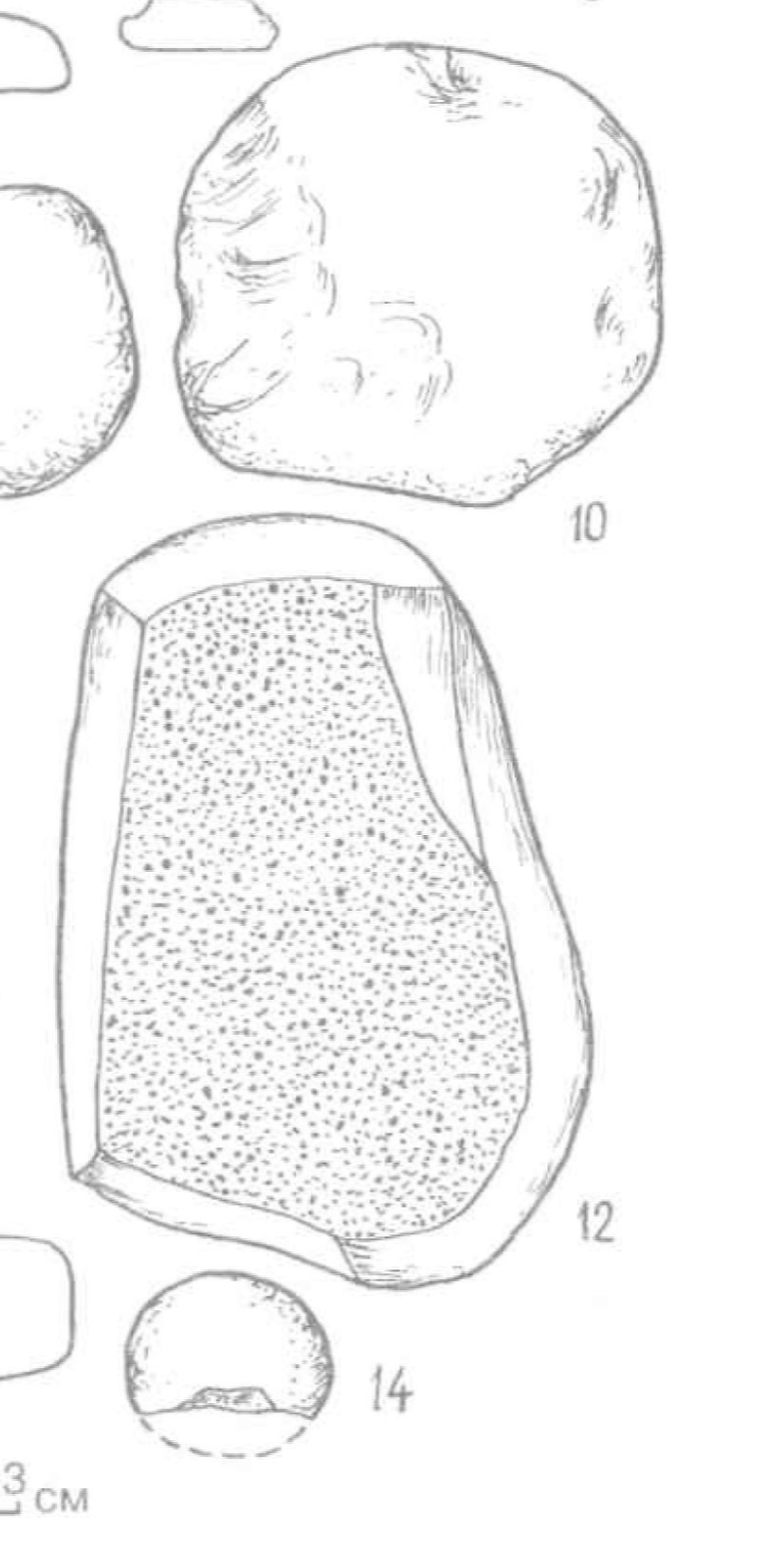 그림 1. 루보틴 성곽의 철제도구, 1: 도끼, 2-톱 편, 3-마치, 4-천공도구, 5,10-송곳, 6-끌개편, 7-송곳(손잡이가 있는)의 날 부분, 8,9-끌, 11-공이, 12-낫?