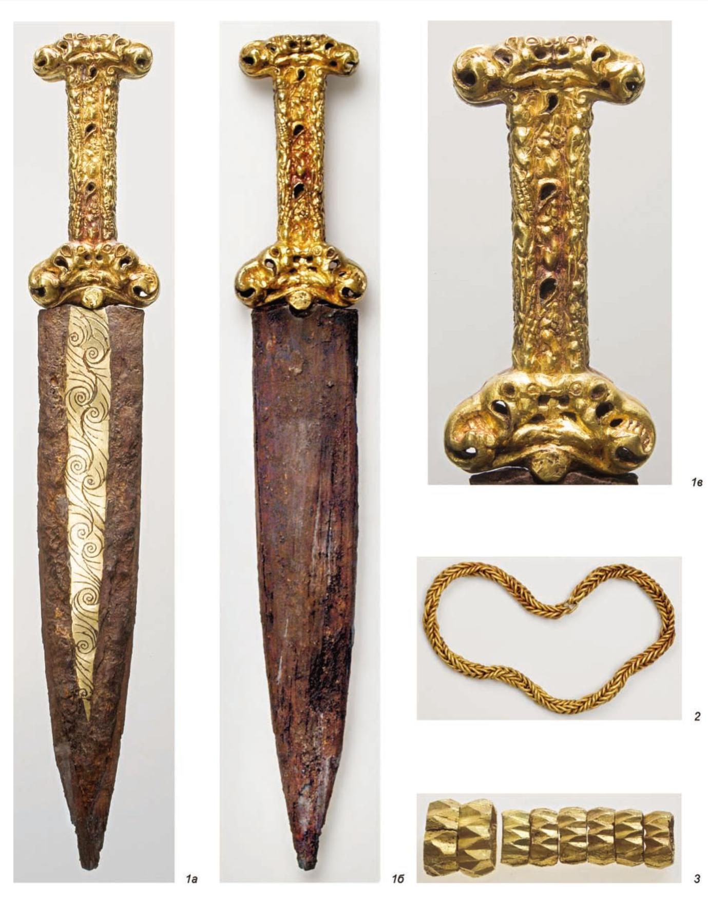 그림 1. 아르잔-2호 무덤방 5호 출토, 1-여성의 검, 2,3-여성의 팔찌