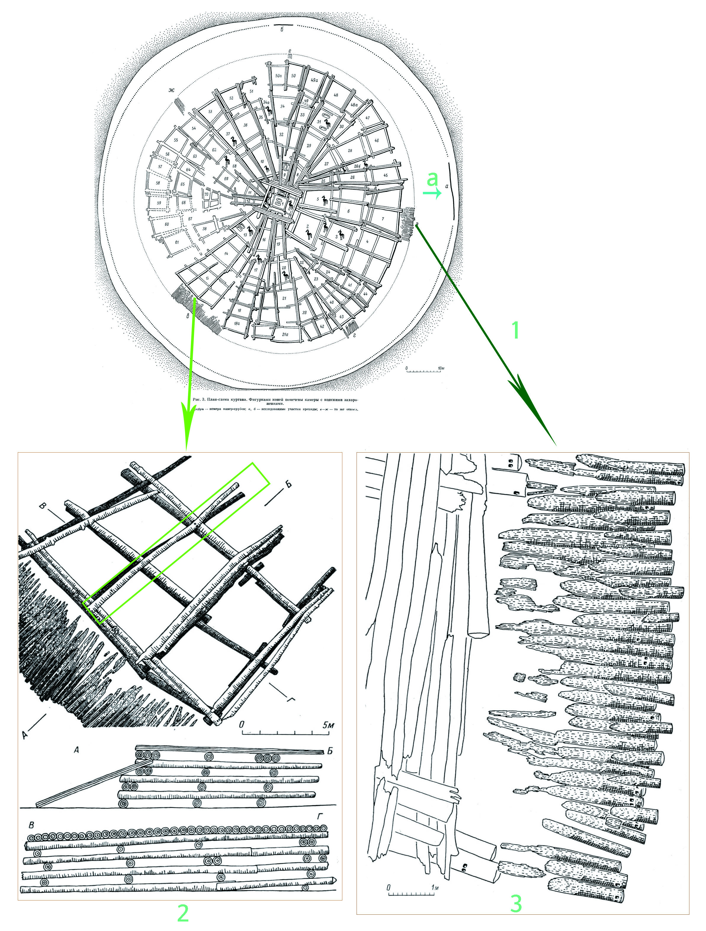 그림 1. 아르잔 1의 무덤구조, 1-전체평면도, 2- 무덤방 15번의 단면도, 3- 7번 무덤방 앞의 목재