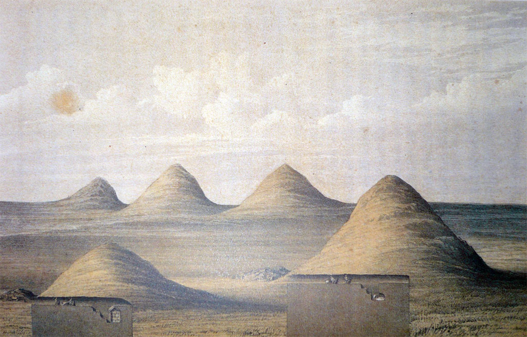 이 유적은 교통로에 위치하는데, 바로 인접한 돈강의 항구역할을 했을 것으로 생각된다. 엘리자베토프스코예 성곽이 스키타이 유적이라는 강력한 증거 중에 하나는 마을 앞에 위치한 스키타이 쿠르간 때문이다. 퍄티 브라체프 쿠르간(그림 5)이라고 불리는 쿠르간인데, 5기의 고분이 한 그룹을 이루고 있다.