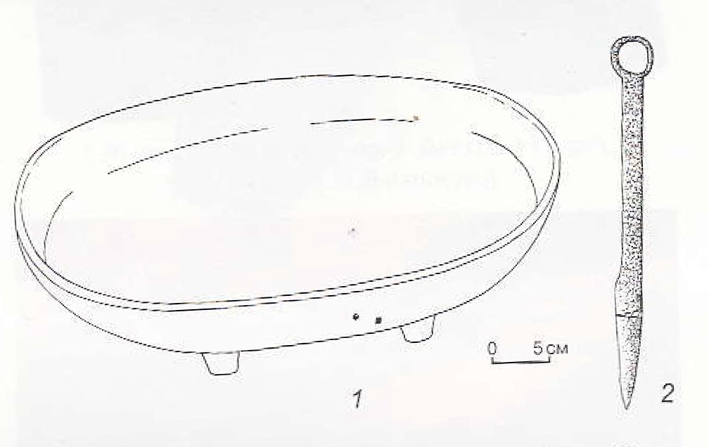 그림 3. 베르흐 칼쥔 II유적 출토 3호분 목제 쟁반(1:그림 1과 동일)과 칼(2)