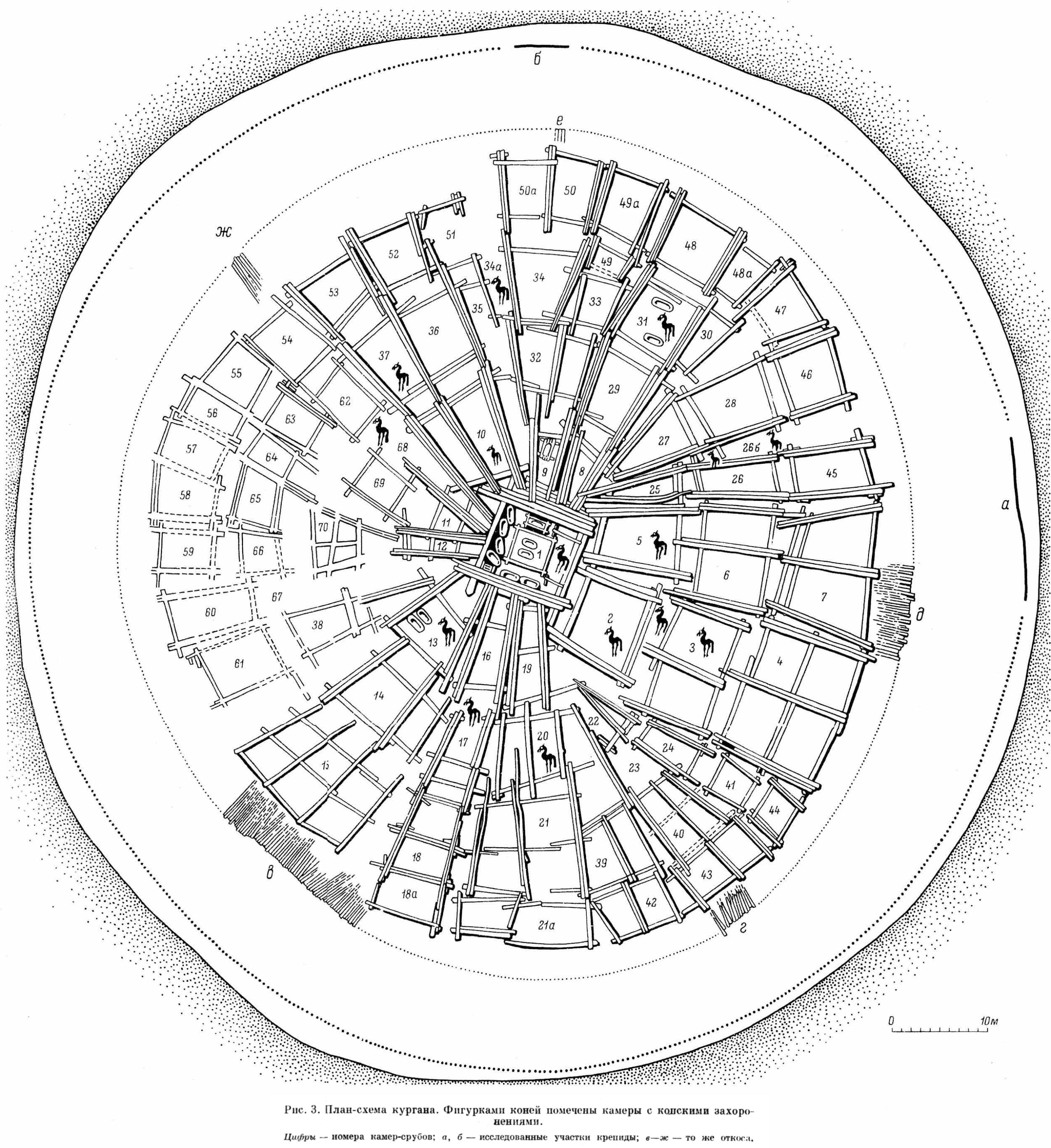 아르잔 유적의 1호는 봉분이 있는 직경이 120m가 넘고, 봉분을 제거한 후에 드러난 나무방은 직경이 80m가량이다. 직경 80m안에는 무덤방이 70여개 있었을 것으로 생각된다(그림2). 무덤은 현대에 이미 훼손된 상태여서 무덤방의 숫자가 정확하지는 않다.