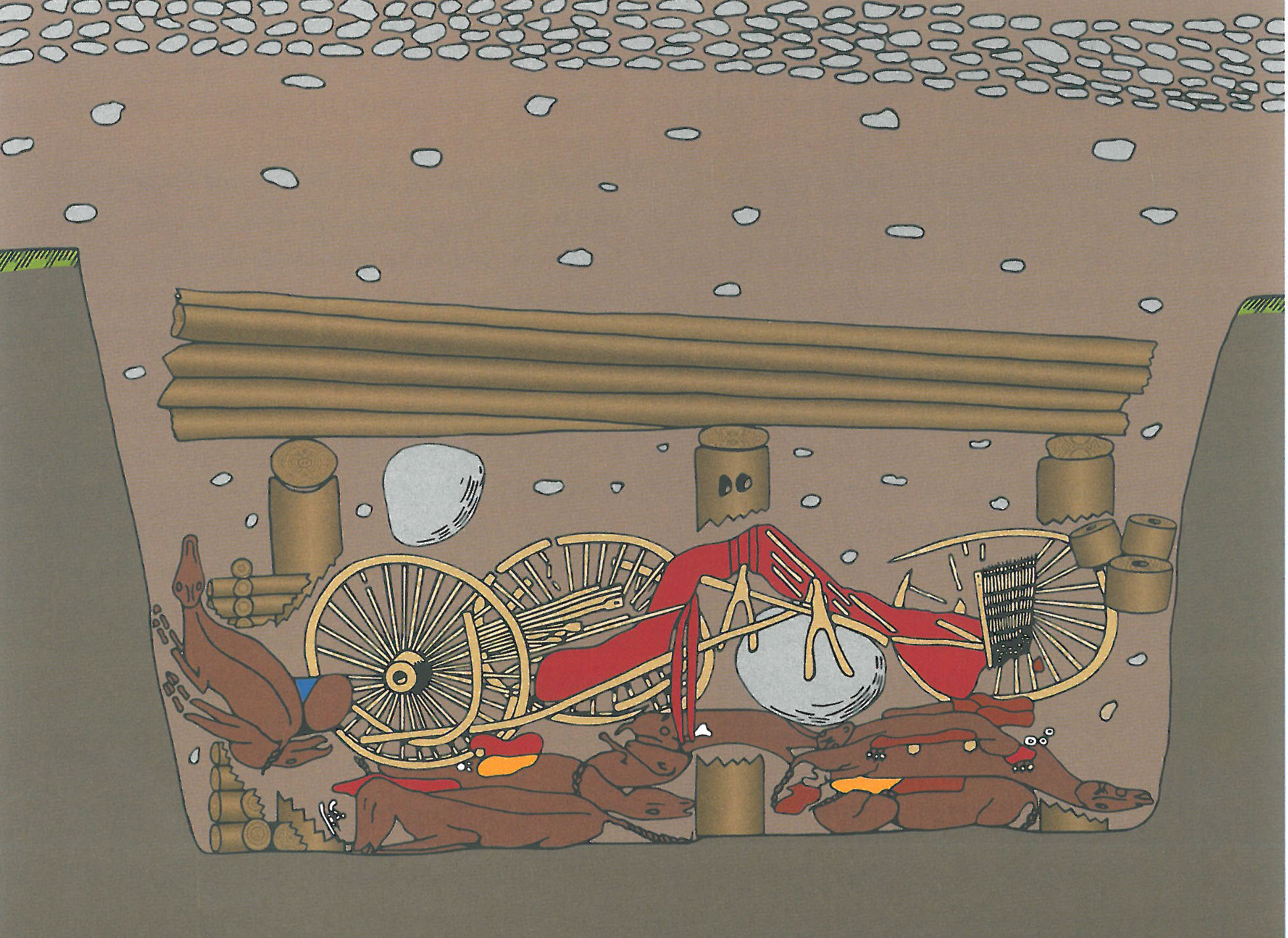 무덤구덩이는 기본적으로 무덤방을 설치한 후 남는 공간을 이용해서 매우 좁다. 말 9마리와 마차를 부장하기 위해서 층층이 쌓아서 넣었다. 무덤방의 바깥에 무덤위의 돌을 지지하기 위해서 수직으로 세운 세 개의 기둥이 기준이 된다. 무덤구덩이의 북쪽에서 동쪽 절반은 세 마리 말이 머리 방향이 동과 서로 교차되게 해서 묻혔다. 가장 아래의 말은 IX번 말로 머리방향이 서쪽을 향하고 배는 바닥에 깔고 있고, 그 위에는 머리를 동쪽으로 하고 등을 아래말쪽으로 향하도록 했다. 다시 그 위의 말은 머리가 서쪽으로 향하고 등을 아래로 향하도록 배치되었다. 기둥 뒤에는 동쪽을 향하고 있는 IV번 말만 넣었다. 기둥을 넘어선 서쪽에는 말 3마리가 쌓였는데, 가장 아래의 VIII번 말은 배를 바닥에 깔고 서쪽으로 향하고 있으며, 그 위의 말은 등을 바닥쪽으로 향하고, 머리는 동향이다. 말 위에는 마차가 분해한 채로 부장했고, 그 남은 공간인 가장 서쪽에 말 2마리가 서로 머리를 다른 방향으로 해서 부장되었다. 위에 있는 말은 말 머리가 무덤구덩이의 입구로 향하고 등이 하늘로 보도록 하는 자세이다.