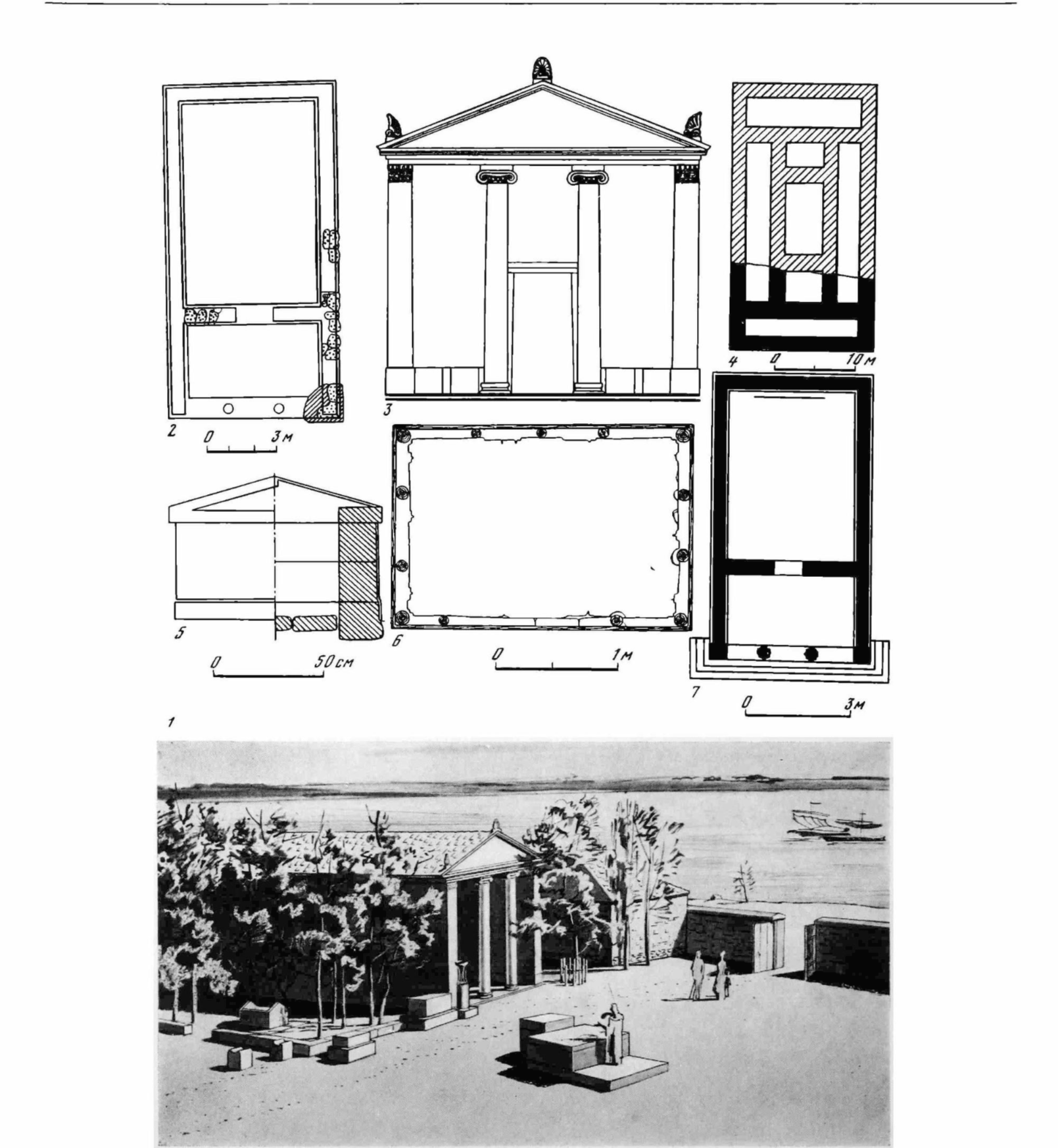 그림 1. 테메노스의 복원도. 1: 기원전 5세기 아폴론 신전 앞의 테메노스 풍경, 2,3: 기원전 5세기 아폴론의 신전 평면도와 입구, 4: 기원전 4세기 아폴론의 신전, 5: 기원전 5세기 제단의 모습, 6: 기원후 1세기 목제 제단, 7: 기원전 3세기 제우스 신전의 평면도