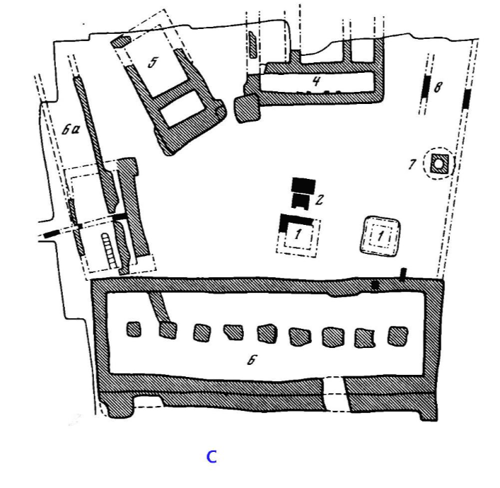 그림 2. 기원전 4~3세기 테메노스의 평면도, 1: 정사각형 건물, 2: 제단, 4: 아폴론의 신전, 5: 제우스 신전, 6: 큰 신전, 6a: 1기와 2기의 신전, 7: 저장고, 8: 동상 제작소